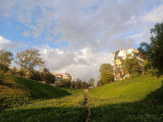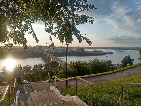 Собственно, все это я оббежала за один день прошлым летом, совершив небольшую прогулочную остановочку, намеренно следуя с пересадками из СПб в Екб. Доверила Яндексу построить обратный пеший маршрут из центра Нижнего Новгорода на вокзал. Навигатор решил, что лестниц было мало – колени еще сгибаются – надо больше, и повел какими-то подворотнями, точнее заворотнями. Буквально в центре города за забором отеля «Азимут» гигантский как будто бы карьер, который местные обходят по верху, а Яндекс заставил спуститься вниз по разрушенной и заросшей крапивой и репейником лестнице, на не менее заросшую тропинку. Без освещения, какие-то кусты – славное укрытие для маньяков. То, что местные обходят это место, поняла по, во-первых, отсутствию людей, во-вторых, из середины ямы увидела такую же разрушенную и заросшую сорняком лестницу наверх впереди тропинки, пустую, в-третьих, пешеходный мост, соединяющий две половины этой низины, и толпы людей на нем. Но снизу открывался красивый вид уже в предзакатные часы, поэтому было несильно обидно.